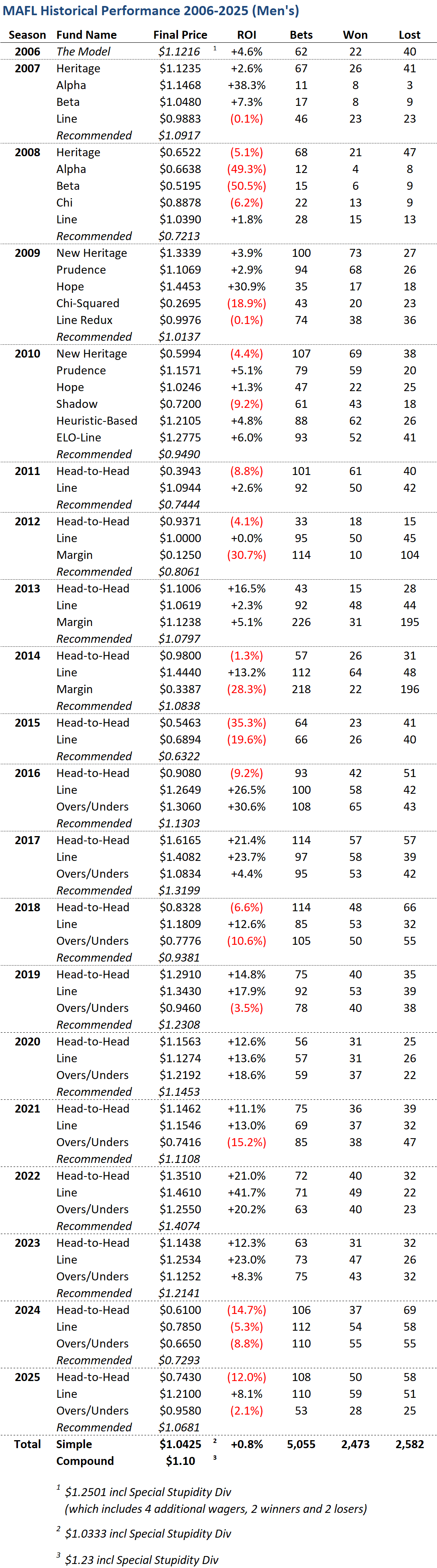 2025, included a jaunty start that saw the Recommended Portfolio up by almost 25c to the end of Round 8, followed by a horror run of losses from Round 9 to Round 20 that left the Recommended Portfolio down by 3c. Thereafter followed two solidly profitable rounds before some small losses in the remainder of the homa nd away season leading up to a mildly unprofitable Final series. In the end, the Head to Head Fund finished at 74.3c from a -12% ROI on a 2.1 turn, the Line Fund at $1.21 from a +8% ROI on a 2.6 turn, and the Overs/Under Fund finished at 95.8c from a -2% ROI on a 2 turn. That left the Recommended Portfolio up by just under 7c.